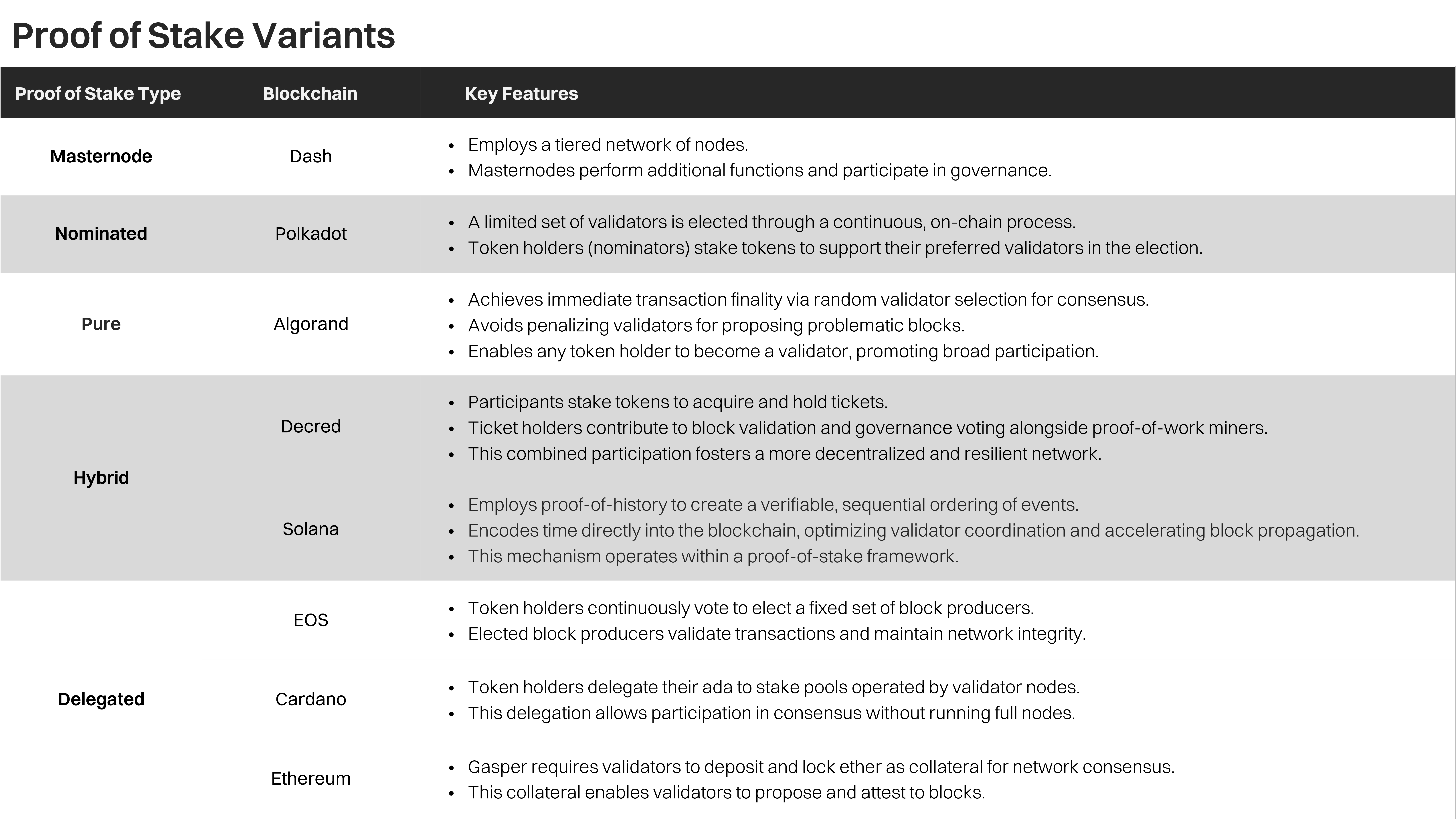 - Masternode PoS: Extends Nominated PoS with masternodes performing additional functions (e.g., instant transactions).