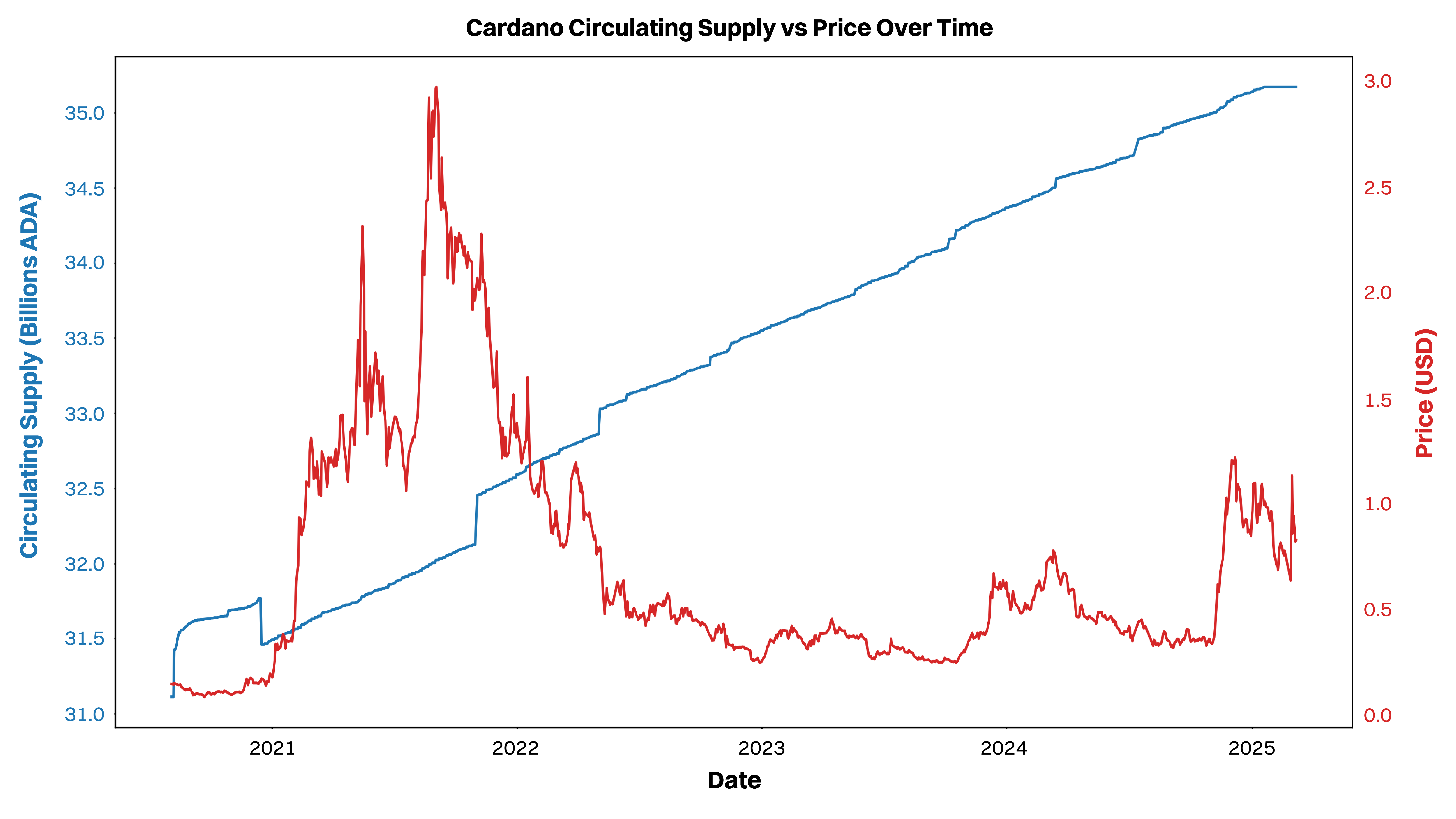 Cardano Supply vs Price: The relationship between circulating supply and price shows that while there is a negative correlation, the market can absorb supply increases within certain thresholds.